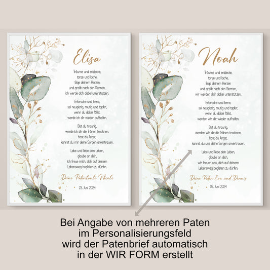 Patenbrief Poster Patenkind Taufgeschenk Taufe personalisiert Taufbrief Eukalyptus Mädchen Jungen Grün