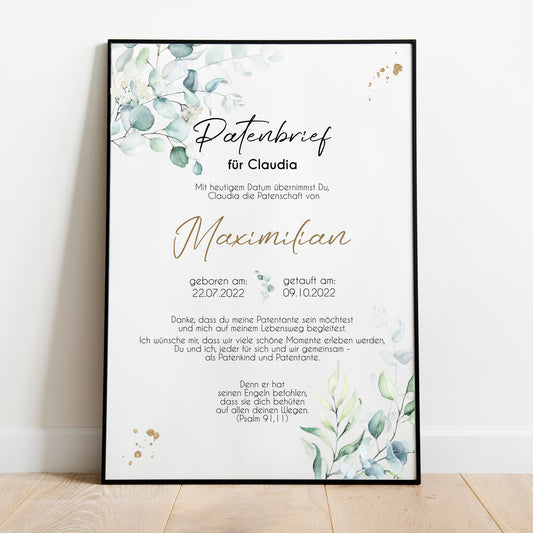 Patenbrief für Patentante Patenonkel personalisiert Taufe Eukalyptus