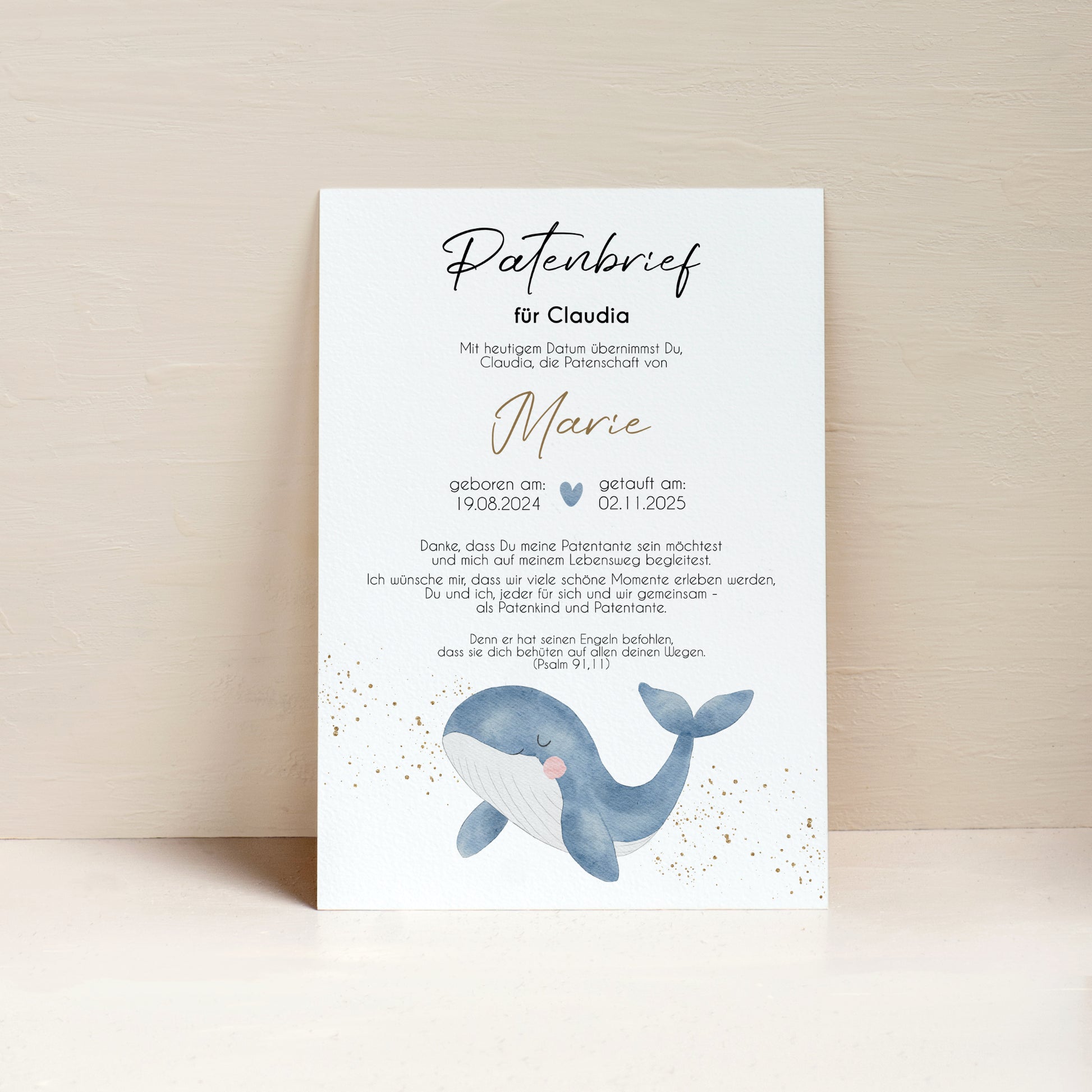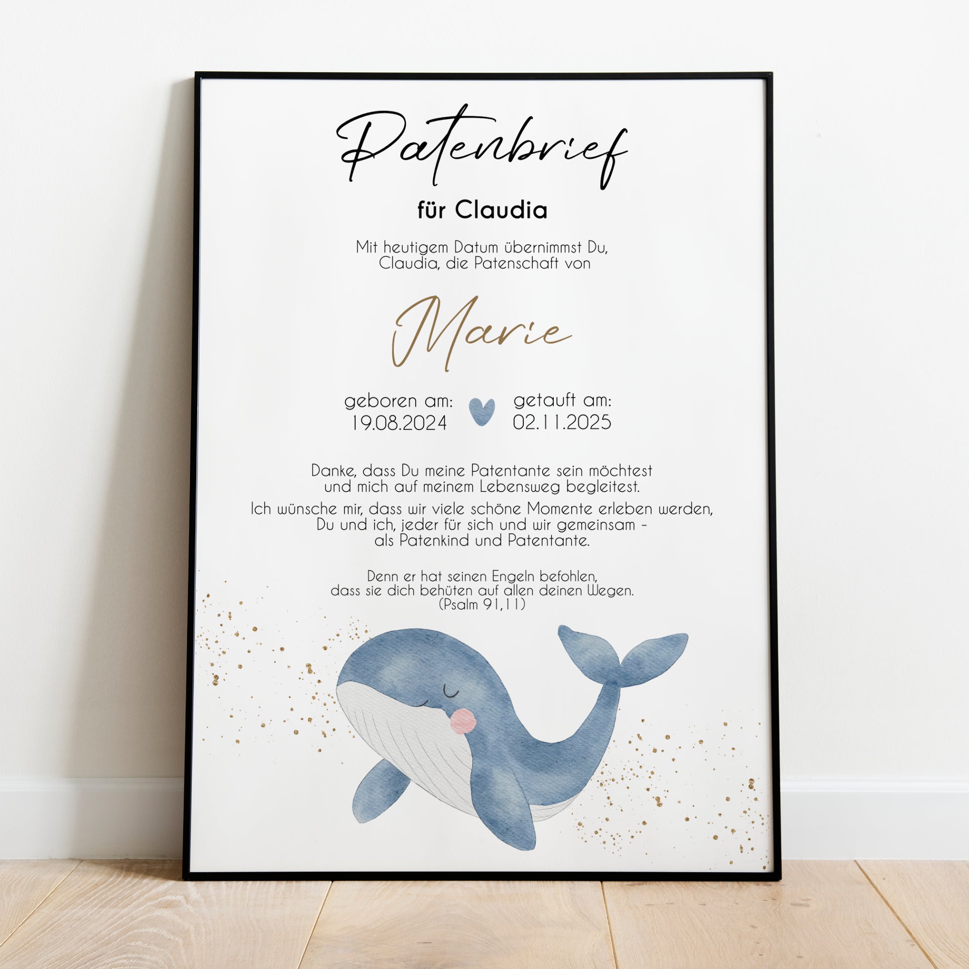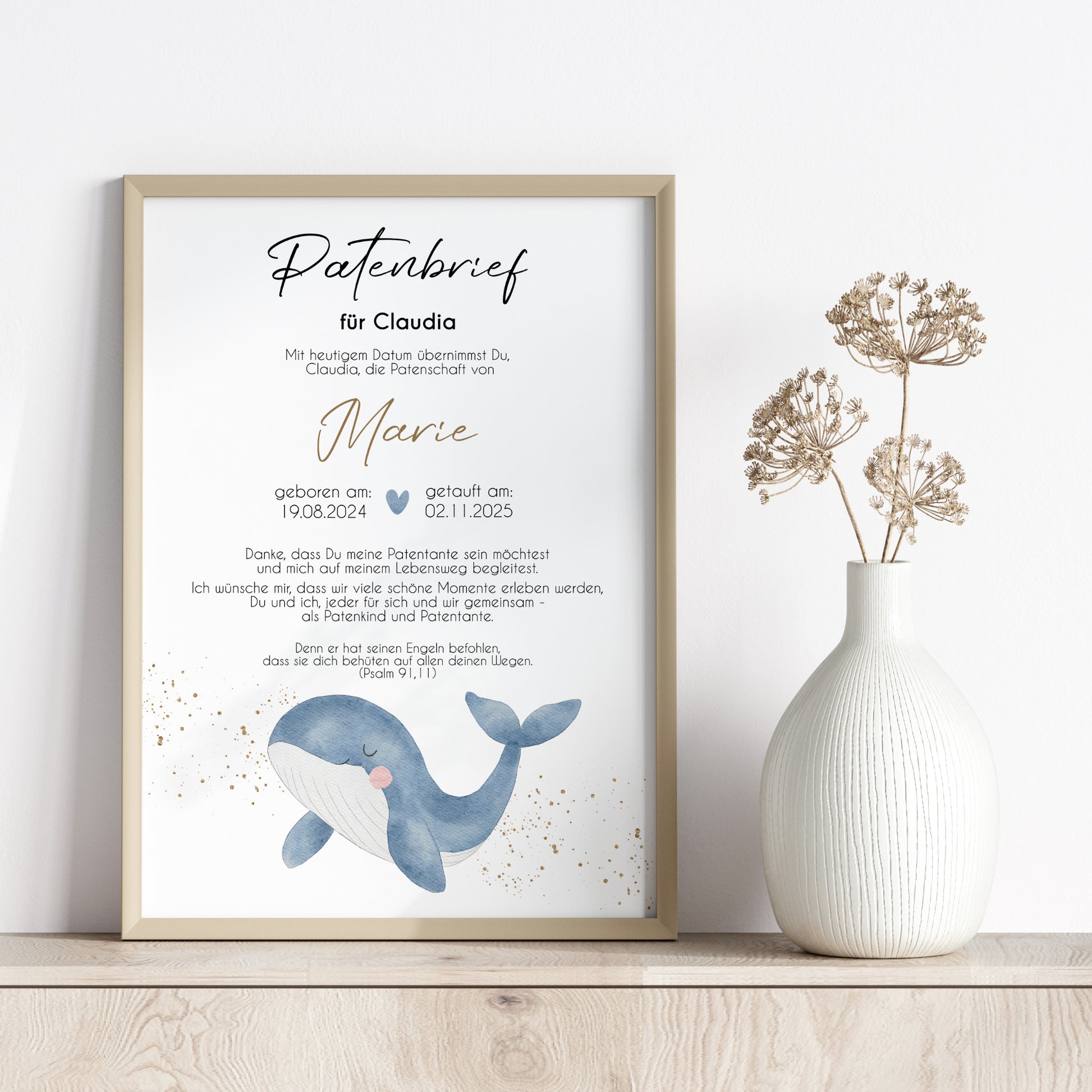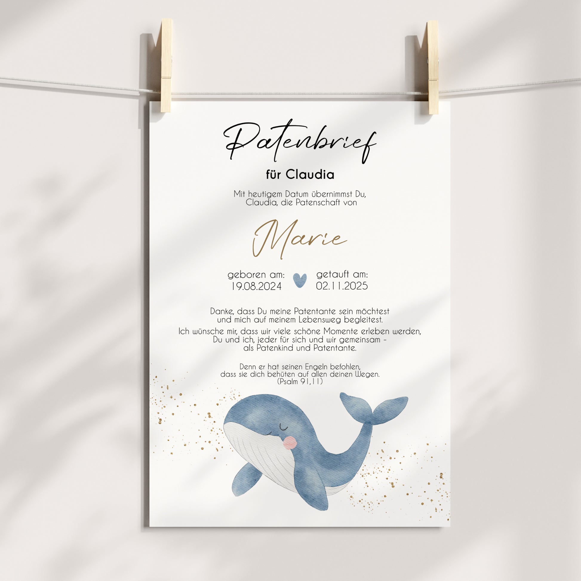Patenbrief für Patentante Patenonkel Geschenk zur Taufe Poster personalisiert Wal Taufgeschenk Taufbrief